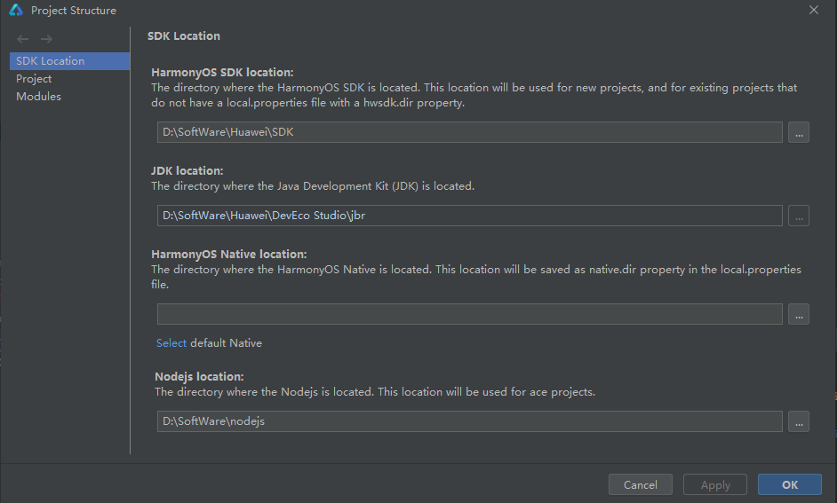 Project Structure—>SDK Location,修改HarmonyOS SDK和Nodejs的位置