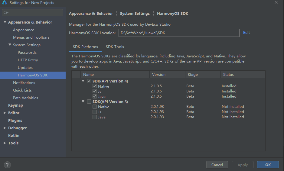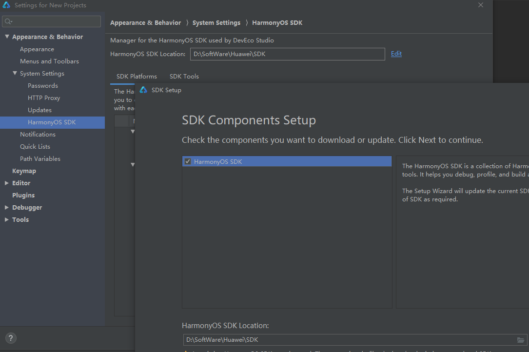 Apperance&Behavior—>System Settings—>HarmonyOS SDK,下载SDK Platforms和SDK Tools