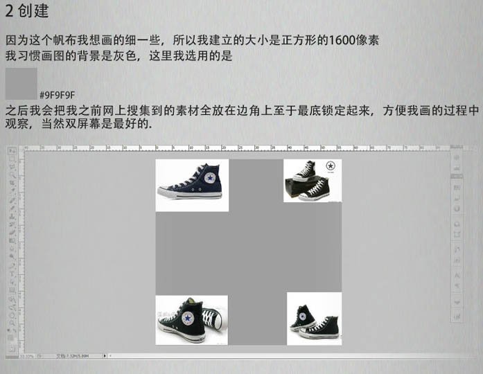 因为这个帆布我想画的细一些,所有我建立的大小是正方形的1600像素,我习惯画图的背景是灰色,这里我选用的是#9f9f9f,之后我会把我之前网上搜集的素材全放在边角上至于最底锁定起来,方便我画的过程中观察。