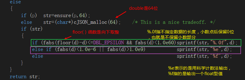 绿色框中指的是这个数如果是一个大于INT_MAX的整数就输出为整数保存在str中,紫色框中的部分表示的是如果这个数是一个很小的数或者大于10^9,则以科学技术阀保存在str中,最后一个就和上一个相反了。最后返回str字符串。