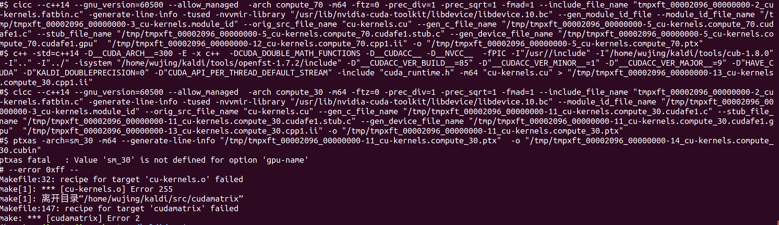 在ubuntu18.04安装kaldi时,遇到Value 'sm_30' is not defined for option 'gpu-name'的报错,在网上招了很多办法都没有解决,大部分的方法都是修改Makefile里面的sm_xx,但是还没解决。