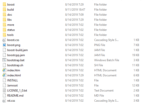 首先在Boost官网(https://www.boost.org/)上下载所需的压缩文件,然后解压后打开会发现如下文件