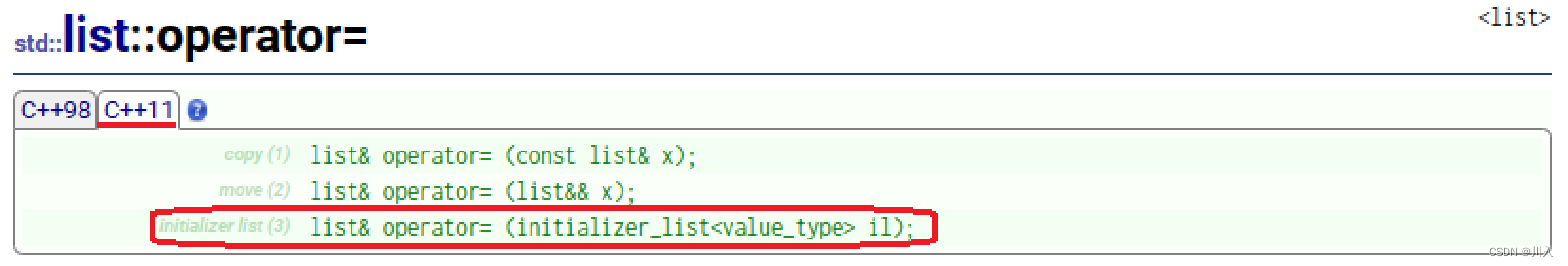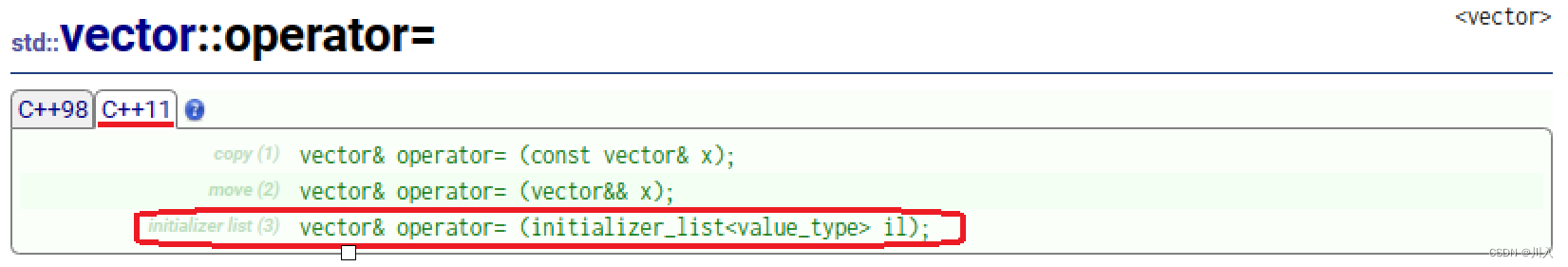 在initializer_list的封装里拥有begin,end。可以说是将initializer_list封装成了一个迭代器,而STL中容器就是利用此,通过调用构造函数利用initializer_list所封装的迭代器进行初始化。(该构造函数为C++11新增)。对于operator=也是同理: