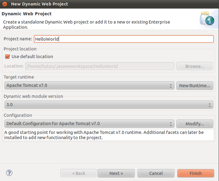 在弹出的对话框中输入Project Name,这里输入HelloWorld