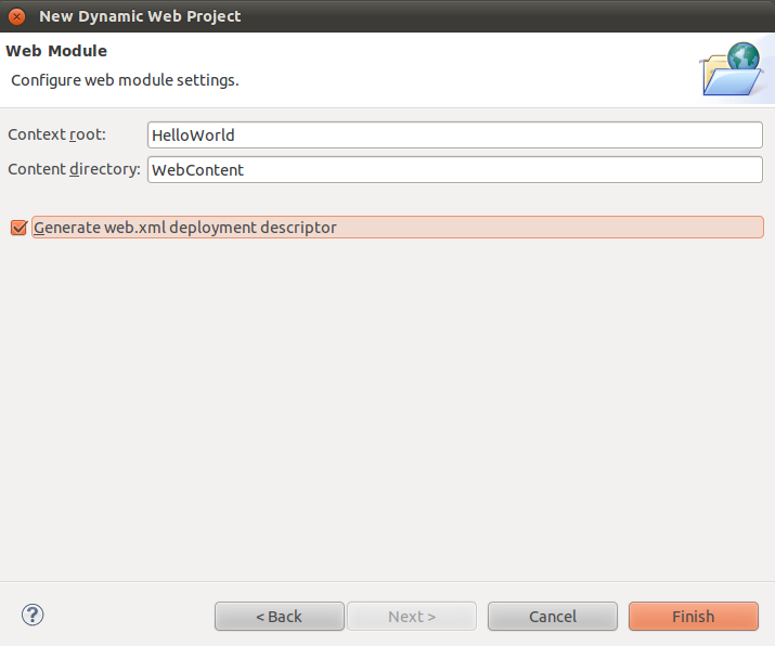 点击Next,设置源文件目录,这里保持默认,再点击Next,这里是设置根目录的,我们也保持默认,不过需要勾选"生成web.xml",这样项目会自动帮我们创建web.xml(当然,也可以之后手动创建,效果是一样的),如下图所示: