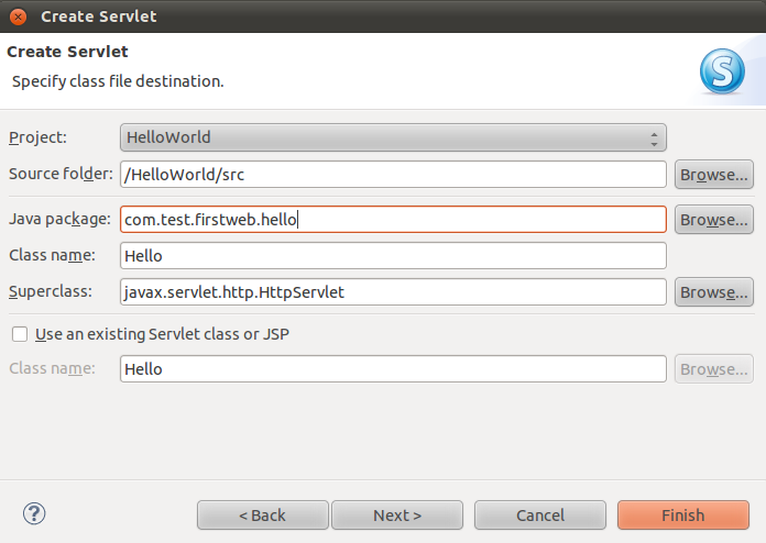 在HelloWorld的Web Content右键选择New-->Other-->Web-->Servlet,按下图设置: