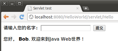 在浏览器中输入http://localhost:8080/HelloWorld/servlet/Hello