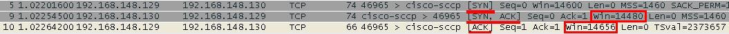 TCP连接建立之时的收端的初始接受窗口大小是14600,细节如图2所示(129是收端,130是发端)