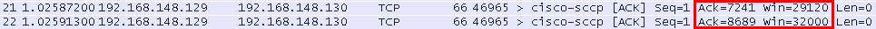 第21个包,收端确认收到的前7240个字节数据,7241的意思是期望收到的包从7241号开始,序号加了1.同时,接收窗口从最初的14656(如图2)经过慢启动阶段增加到了现在的29120。用来表明现在收端可以接收29120个字节的数据,而发端看到这个窗口通告,在没有收到新的ACK的时候,发端可以向收端发送29120字节这么多数据。