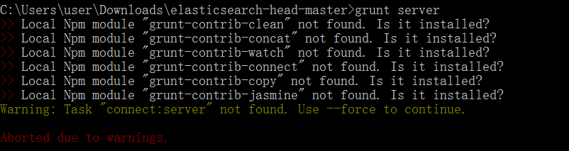 以上就是辛勤巨人最近收集整理的关于elasticsearch-head使用grunt server启动报错的全部内容,更多相关elasticsearch-head使用grunt内容请搜索靠谱客的其他文章。
