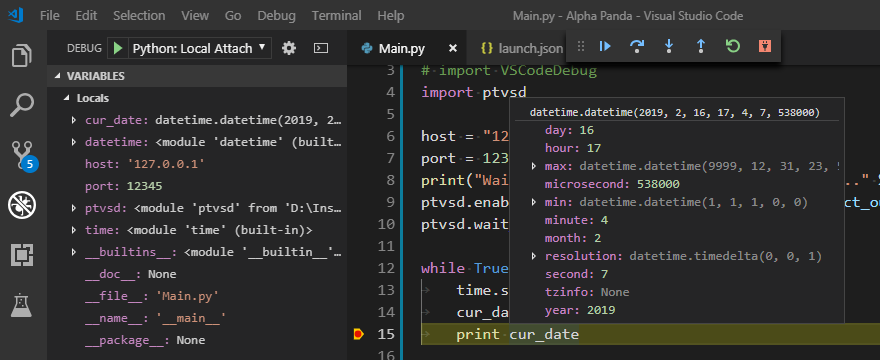 # -*- coding:utf-8 -*- import datetime, time # import VSCodeDebug import ptvsd host = "127.0.0.1" # or "localhost" port = 12345 print("Waiting for debugger attach at %s:%s ......" % (host, port)) ptvsd.enable_attach(address=(host, port), redirect_output=True) ptvsd.wait_for_attach() while True: time.sleep(1) cur_date = datetime.datetime.now() print cur_date