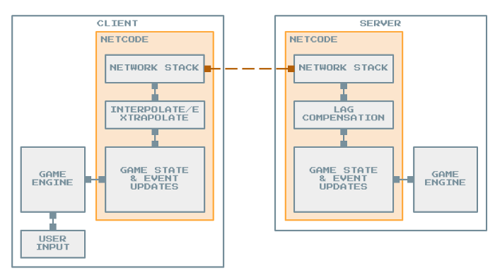 在可能以不同速度运行的不同机器上执行所有这些同步,同时处理比如延迟,丢包和有限带宽的物理限制,所有这些都属于这个通用术语“NetCode”。