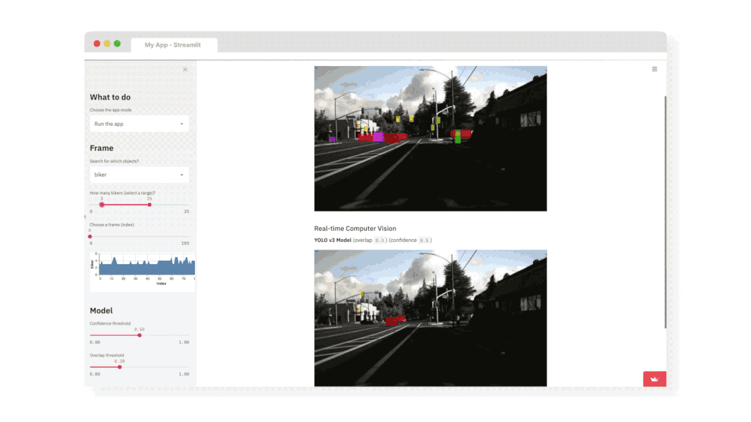 除此之外,streamlit官方还提供了一个稍复杂的应用,它结合了yolov3的目标检测算法,仓库地址:https://github.com/streamlit/demo-self-driving,感兴趣的可以去研究研究,代码简短,但功能完整