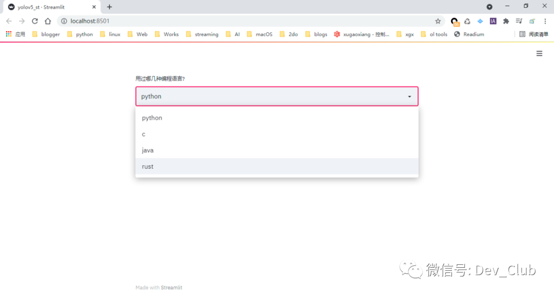 st.selectbox('用过哪几种编程语言?', ('python', 'c', 'java', 'rust'))