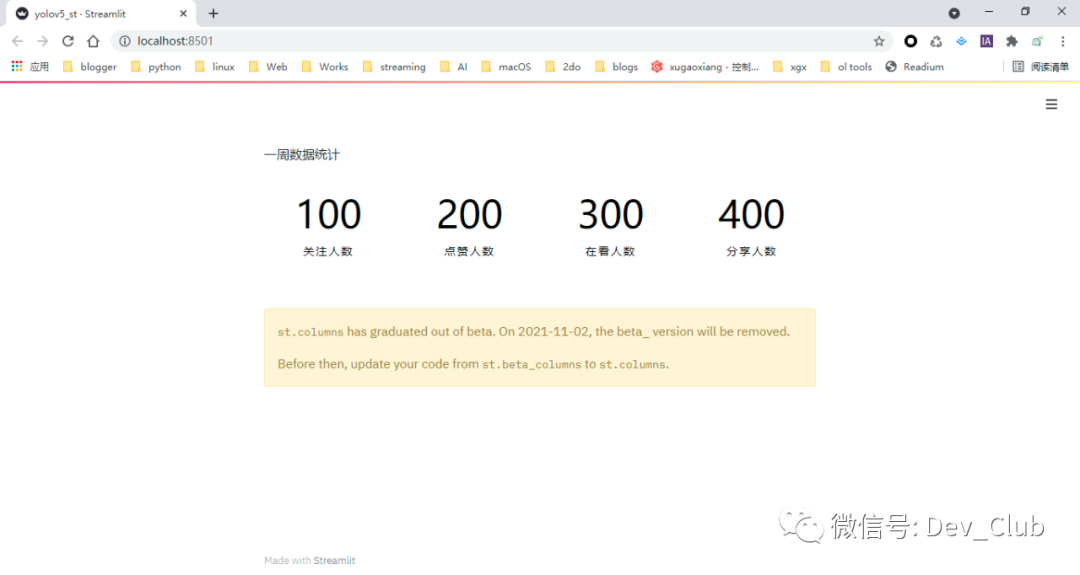 streamlit是一个开源的python库,它能够快速的帮助我们创建定制化的web应用,而且还非常便于和他人分享,特别是在机器学习和数据科学领域。整个过程不需要你了解任何前端的知识,包括html、css、javascript等,对非前端开发人员非常的友好。