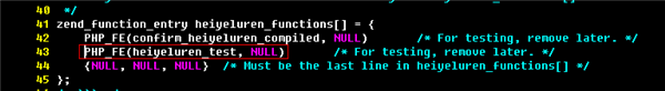数组里增加我们的函数,找到 zend_function_entry heiyeluren_functions[],增加: