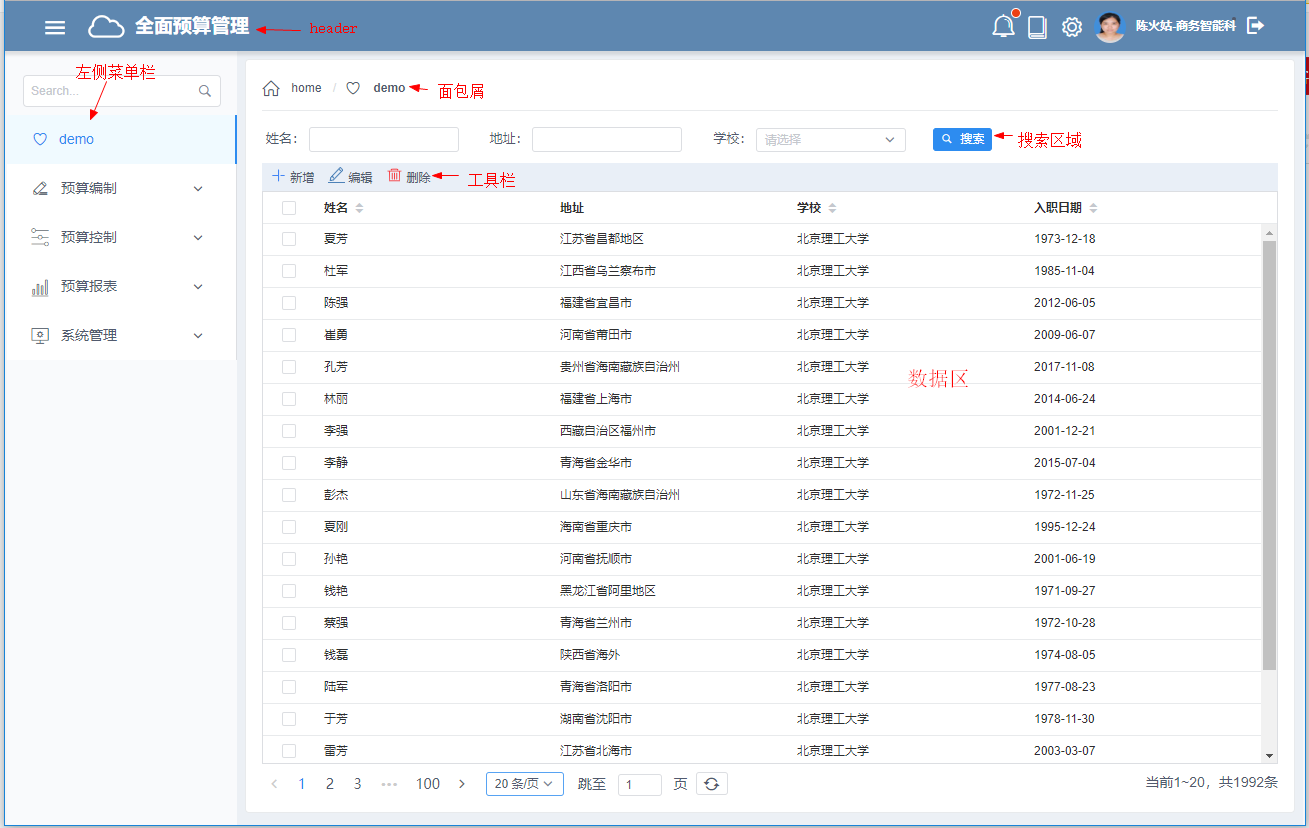 我个人看这种界面的时候,是非常不喜欢竖向出现滚动条的,像搜索区域、工具栏这种固定的区域我希望是不动的,只需要拖拽表格的滚动条就可以看其他数据(就像上面的截图)。