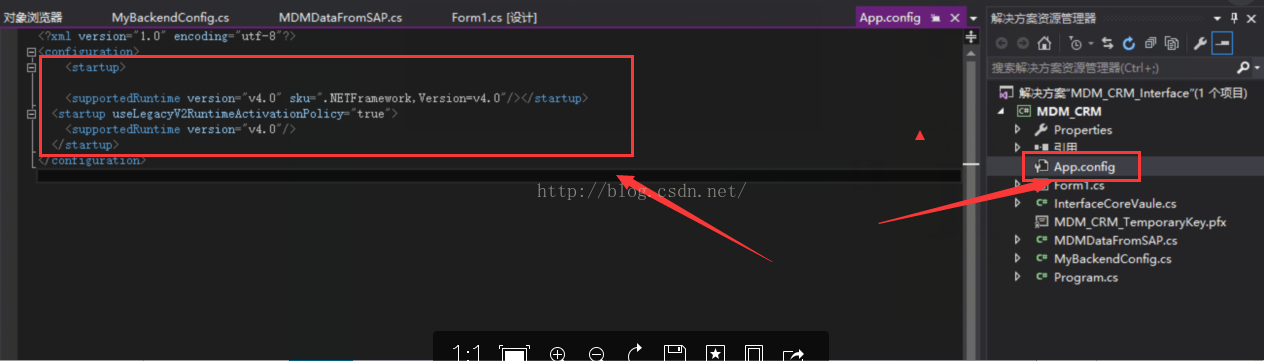 .net 4.0通过sap connector 4.0调用RFC时需要注意,在app.config中需要做如图中配置,否则会引起错误抛出