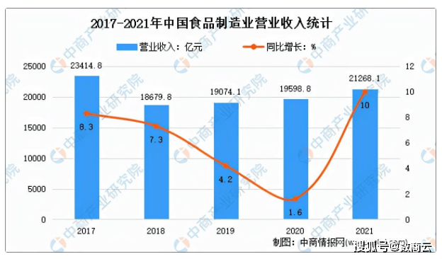 食品制造业是我国产业发展中的重要组成部分,具有点多、面广、投资小、见效快的特点,在经济发展中发挥着重要作用。根据工信部数据统计,从2018至2021年我国食品制造业经营规模稳步增长,2021年我国食品制造业营业收入达21268.1亿元,同比增长10%。