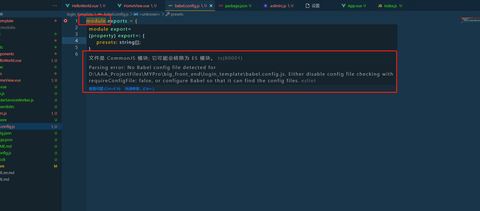 Parsing error: No Babel config file detected for D:AAA_ProjectFilesMYProbig_front_endlogin_templatebabel.config.js.