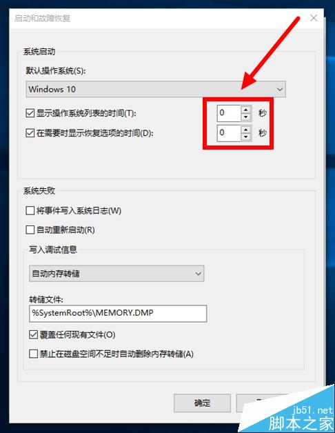5、把“显示操作系统列表的时间”和“在需要时显示恢复选项的时间”都改为“0”秒。