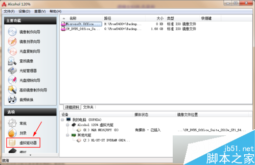 6、打开Alcohol 120%虚拟光驱软件,在左下角的“选项”中,点击“虚拟驱动器”;