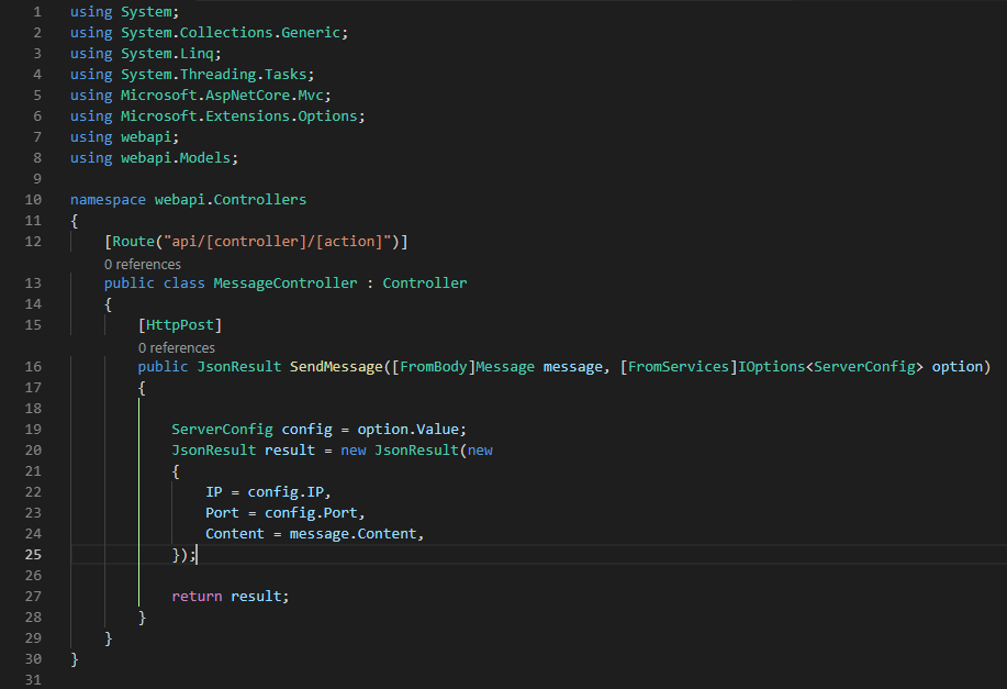 这里顺便提一下web api的知识,有人经常遇到[FromBody]Message message,接收到实体的时候得到的是null,也没有抛异常,这个问题通常是传参的时候,有字段没法反序列化的原因,比如一个int类型的属性ID,传参的时候比如是“123456789”。