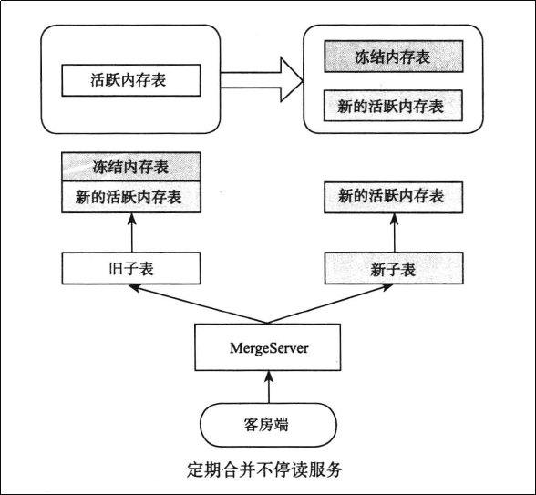 如图,活跃的内存表冻结后生成冻结内存表,后续的写操作进入新的活跃内存表。定期合并过程中 ChunkServer 需要读取 UpdateServer 中冻结内存表的数据、融合后生成新的子表,即:新子表 = 旧子表 + 冻结内存表