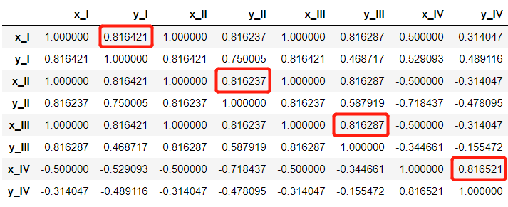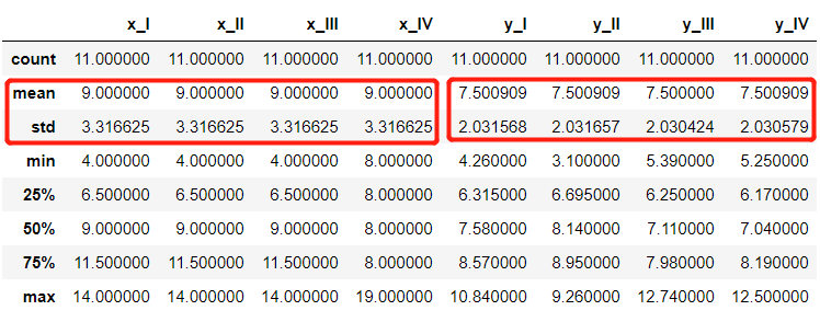 我们可以看到x_I、x_II、x_III、x_IV这四个指标的均值和标准差是完全一样的,y_I、y_II、y_III、y_IV这四个指标的均值和标准差也是完全一样的(忽略小数点差异),几列完全不同的值,均值和标准差竟然会完全一样,这还不是最神奇的,我们接着往下看。