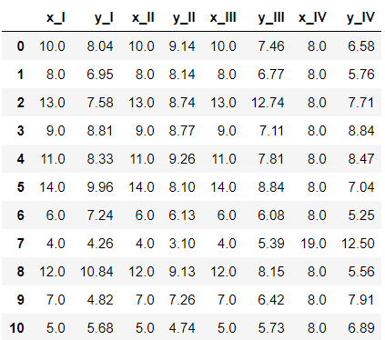x_I 和 y_I是一组数据、 x_II 和 y_II是一组数据, x_III 和 y_III是一组数据, x_IV 和 y_IV是一组数据,我们可以看到这四组数据是完全不一样的。