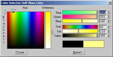 在self-illumination控制器color选项勾选的状态下直接单击color后的色彩调节器在弹出的colorselector:self-illumination对话框中可直接选择自发光的颜色。