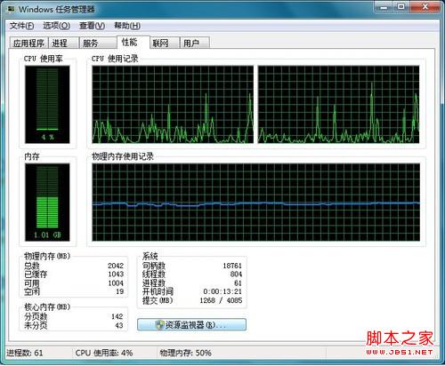 你可以打开微软自带的磁盘碎片整理程序,然后到任务管理的性能选项,点击下面的资源监视器选项。