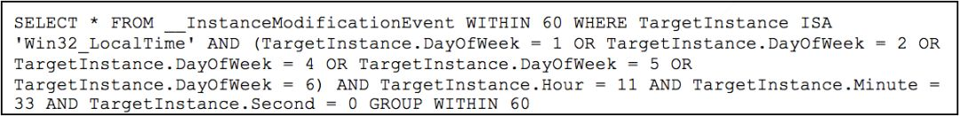 WMI以本地和远程方式提供了许多管理功能,包括查询系统信息、启动和停止进程以及设置条件触发器。管理员可以使用各种工具(比如Windows的WMI命令行工具wmic.exe)或者脚本编程语言(如PowerShell)提供的API接口来访问WMI。这样一个强大的工具自然会被黑客所盯上,著名的无文件攻击病毒POSHSPY就使用WMI来存储及定时执行恶意代码。以下是此病毒使用的一个触发器,意思是每周一、周二、周四、周五以及周六的当地时间上午11:33执行一次恶意脚本。