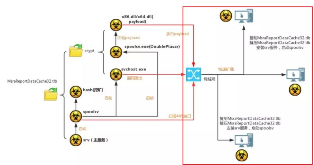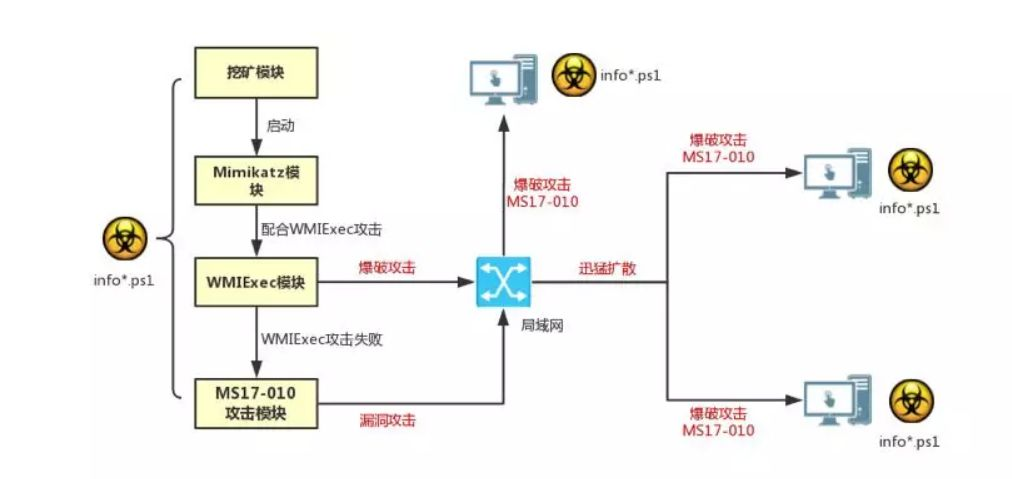 勒索病毒、挖矿病毒已经存在已久了,但为什么WannaCry、WannaMine影响那么大?就是因为它们使用了SMB漏洞进行传播,可以将自身复制到内网中的所有漏洞主机上,实现大规模的感染。如下图红色框是漏洞利用环节,病毒通过此漏洞可以进行远程攻击。