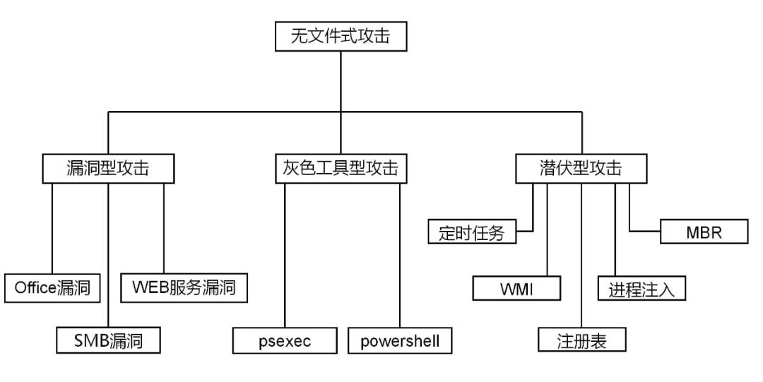 无文件攻击方式分为三大类:漏洞型攻击、灰色工具型攻击、潜伏型攻击,这几类攻击不是独立,有时候会在同一个攻击场景中出现,如用户打开了一个恶意office文档,这个文档通过漏洞直接执行了powershell脚本进行木马植入,最后通过写入注册表实现持久化潜伏。