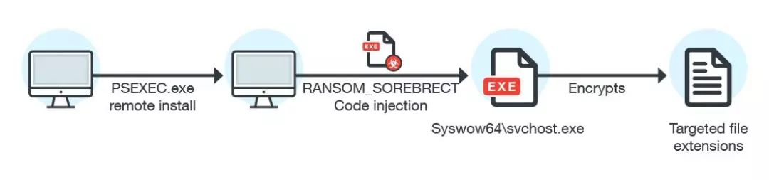PsExec也是windows的系统工具,经常被IT管理员用于远程管理内网主机。但PsExec也有可能会被病毒利用,如下是SOREBRECT病毒,只要SOREBRECT获取了远程主机的管理员密码,就可以使用PsExec远程执行命令,然后将恶意代码注入到svchost.exe中执行。PsExec.exe虽不是系统自带工具,但在windows官网上可以下载,也存在于杀入的白名单中。