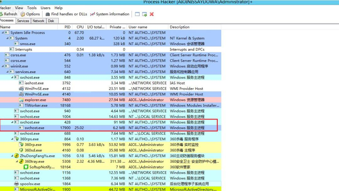 进程注入技术很久以前就被病毒所利用了,病毒运行后一般会将恶意代码注入到系统进程中,然后将自身删除,达到隐藏的效果,如下图是一个新型的挖矿病毒wmixml,它通过将挖矿代码注入到svchost.exe中实现挖矿,我们可以看到svchost.exe的CPU占用率极高,高达25%。