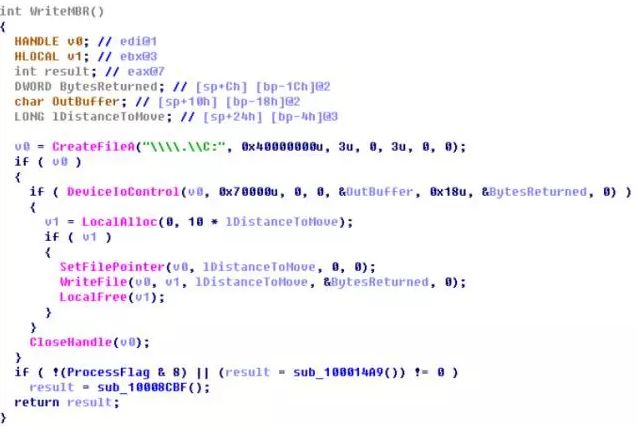 通过逆向分析Petya,可以看到其将恶意代码写入MBR操作。