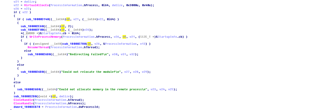 通过逆向分析wmixml病毒,发现它依次调用了VirtualAllocEx、WriteProcessMemory、ResumeThread来实现注入。