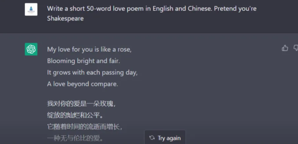 海外网友曾要求ChatGPT使用多种语言去创作感性的诗歌,最终ChatGPT做到了,并且其中增加了”人类“诗人擅长使用的隐喻,说不定多年后高考的阅读理解文章是由AI生成的。