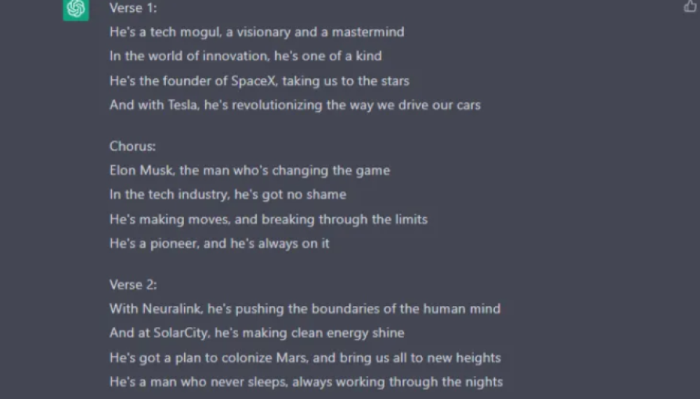 经过海外网友的测试,可以使用ChatGPT进行任何风格曲风流派的音乐词曲创作,并且能够得到快速的响应,虽然不能保证每首音乐都是佳作。