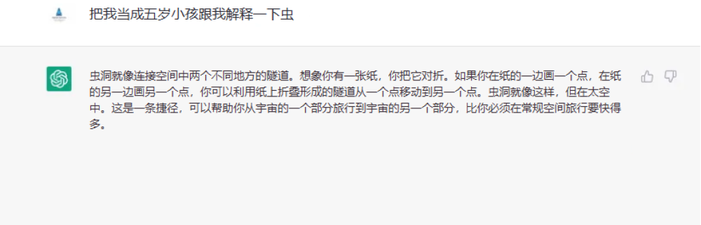 根据海外网友提问的问题显示,能够对ChatGPT下达需要的语气,需要的理解能力所能接受的答案介绍。当海外网友让其以五岁孩子的视角解释黑洞问题,ChatGPT将复杂的黑洞问题进行了具象化和简单化地回答,以用来符合5岁孩子的视角要求,这就显示了其强大的问题理解能力和数据处理能力。