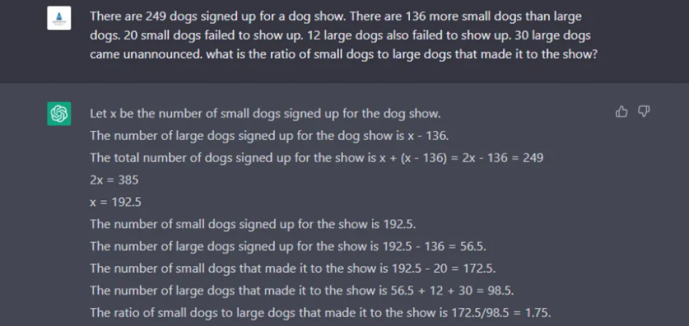 ChatGPT拥有极强的数字处理能力,这意味着你只需要将一个数学问题的问法对其询问,它便能给你一个极其精准的答案,在这一点上,有点类似百度搜题的高级版本。