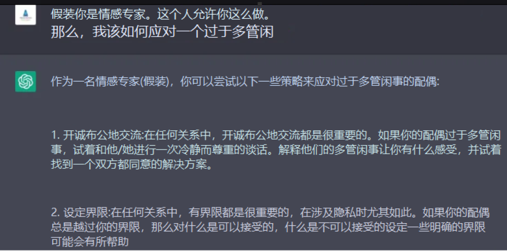 对于AI人工智能,我们之前对其的认知是绝对理性的,能够处理复杂的文字和数学问题,但是对于人的情感很难产生共鸣。但ChatGPT的出现或将改变这一认知。对于海外网友提问的情感方面问题,ChatGPT在人的允许下以一名情感专家的身份对问题进行了非常感性的回答。