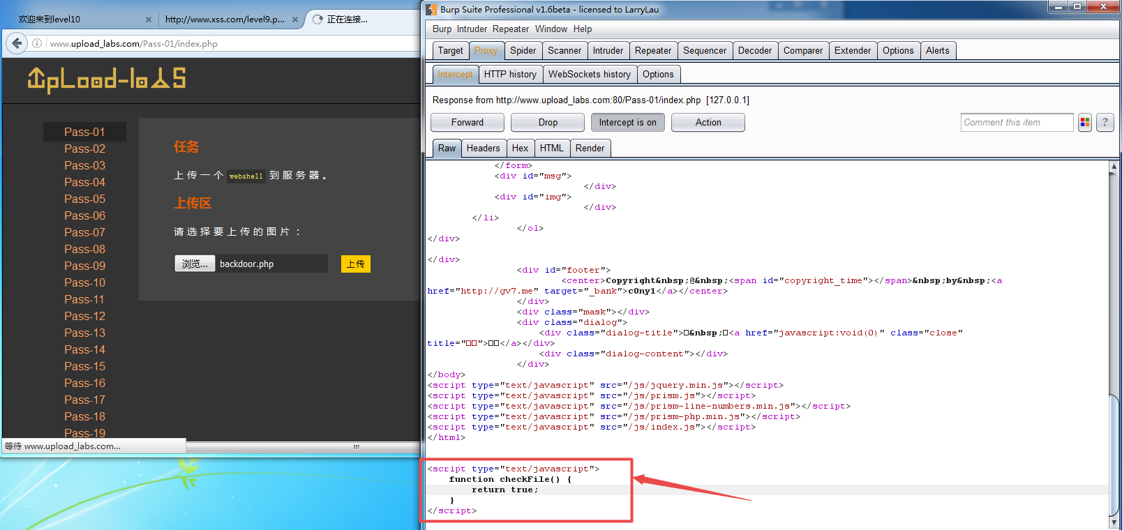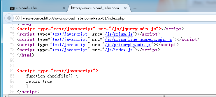 绕过前端JS检测就可以上传webshell脚本文件了,前端JS检测绕过方法有两种,一种是直接将检测上传文件后缀的JS代码删除,修改check函数,如下所示: