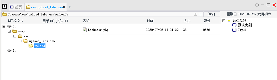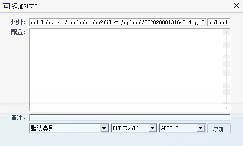 接下来在中国菜刀中添加链接:http://www.upload_labs.com/include.php?file=./upload/3320200813164514.gif ,输入密码upload,选择PHP脚本类型,这样就能成功获取到目标的webshell:
